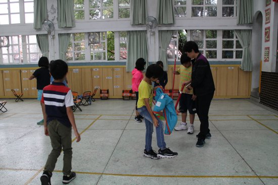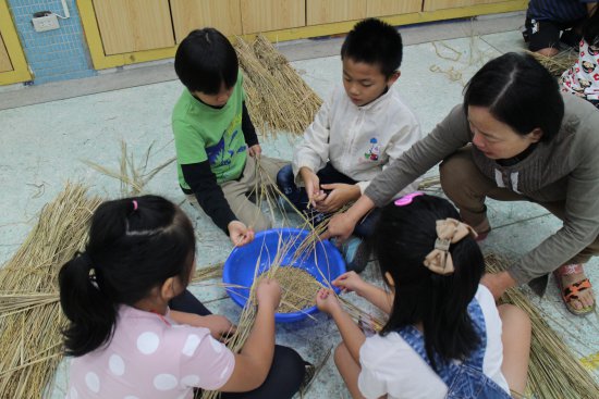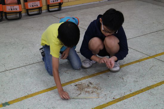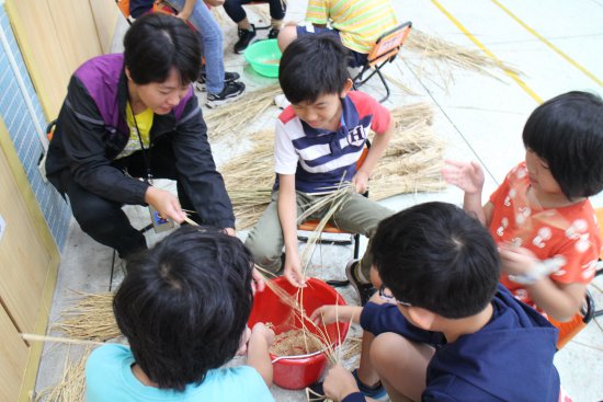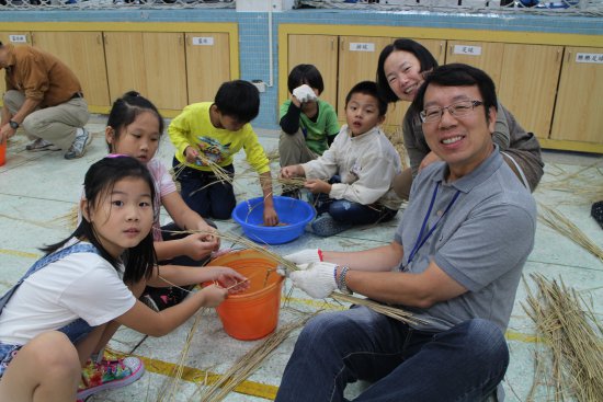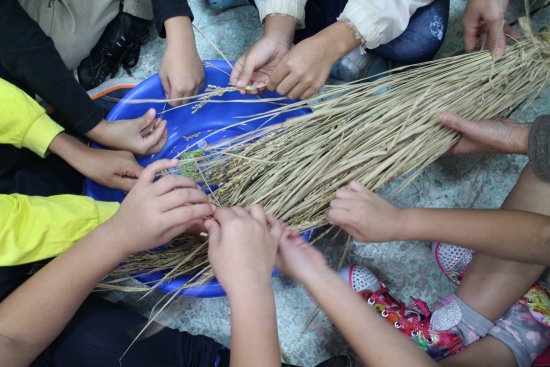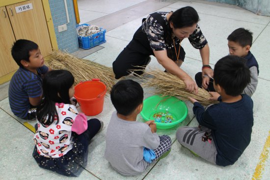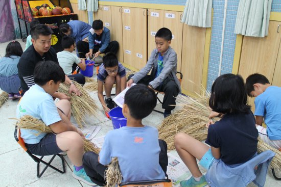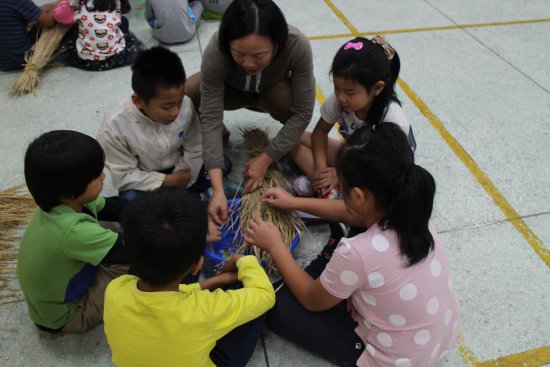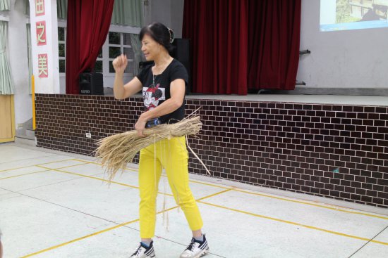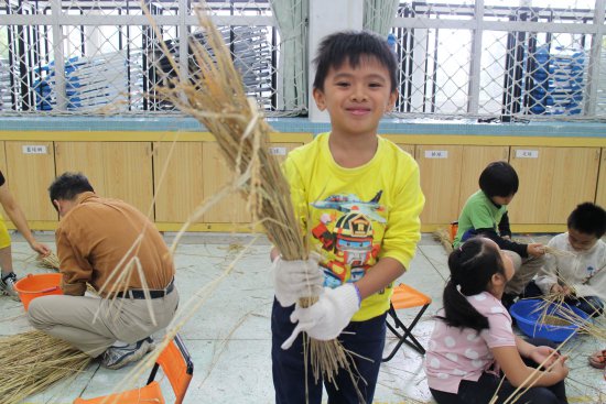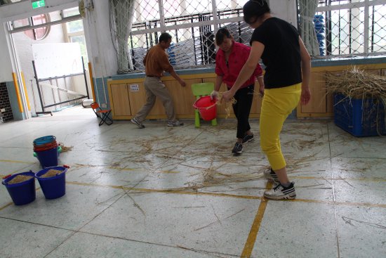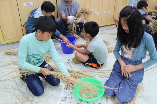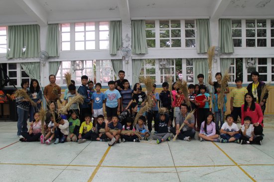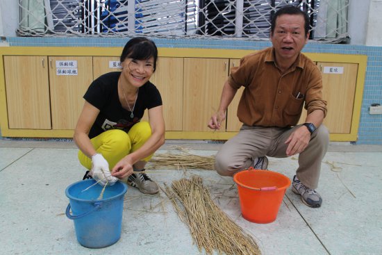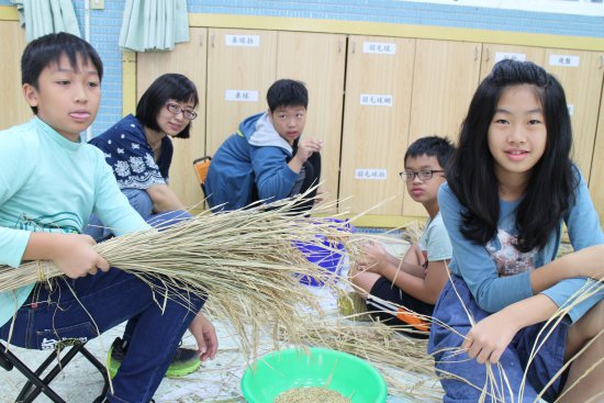 開學收割下來的稻穗經盛旺老師跟小艷辛苦曝曬後