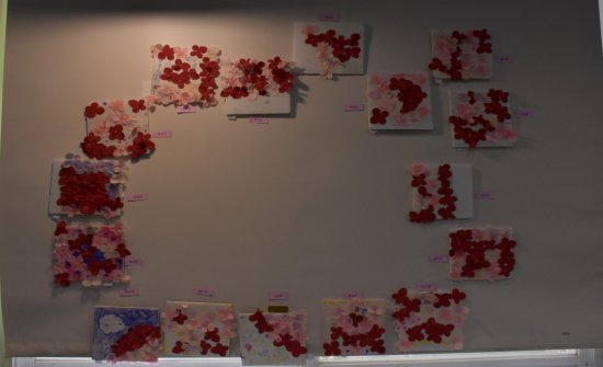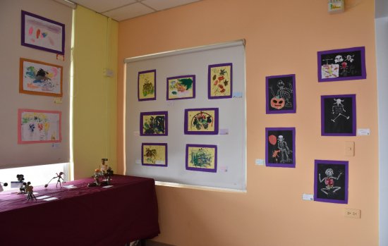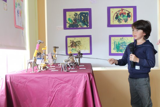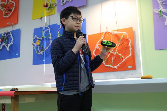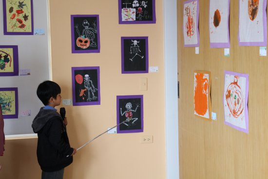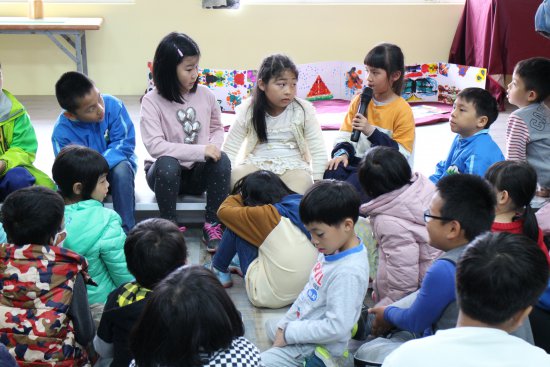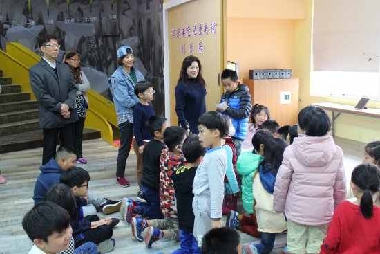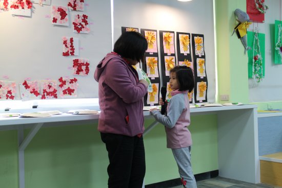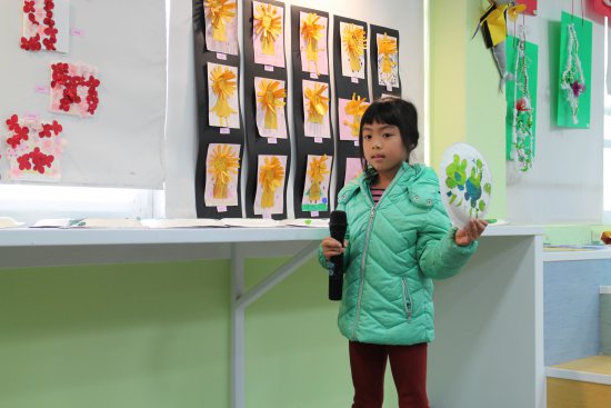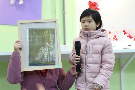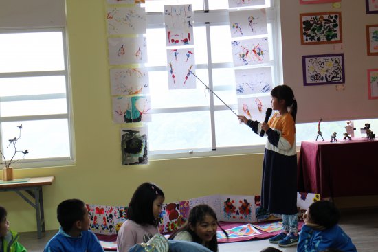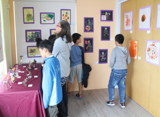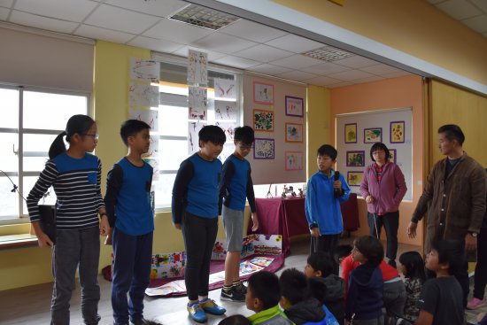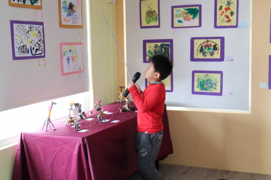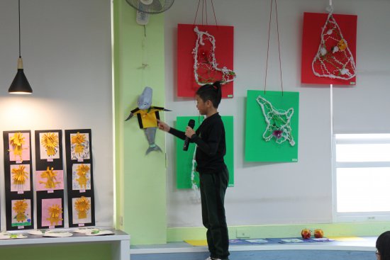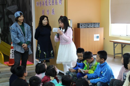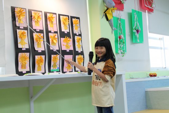 這次展出作品有:用花瓣排列成花兒紛飛的不同圖案;用棉花棒和蠟筆創作出關於萬聖節的各式造型;用校園內枯枝拼接組裝成各式各樣的可愛動物;顏料與線條抽拉出如詩如夢彷彿舞者的畫作;紅包袋組合成喜氣洋洋的宮燈;布料與顏料做出拼布的貼畫;還有利用油土製模,倒進樹酯和螢光粉模擬馬祖藍眼淚發出的藍光,參觀的小朋友藉由暗箱的觀察孔,看到發出藍光的臉譜,十分奇特。在老師們精心擺設及佈置下,社區共讀站宛如小小美術館,孩子們就像美術館專業的「解說志工」,一一介紹著自己創作的概念與象徵的意義,其他同學專心的聽著創作者娓娓道來的創作故事,現場譜出一副美麗的畫面。這次發表活動發生一段小插曲,一年級17位小朋友中原本只有安排5位學生介紹自己的作品,沒想到其他同學卻爭先恐後的想要上台說故事,引來全校師生會心一笑。