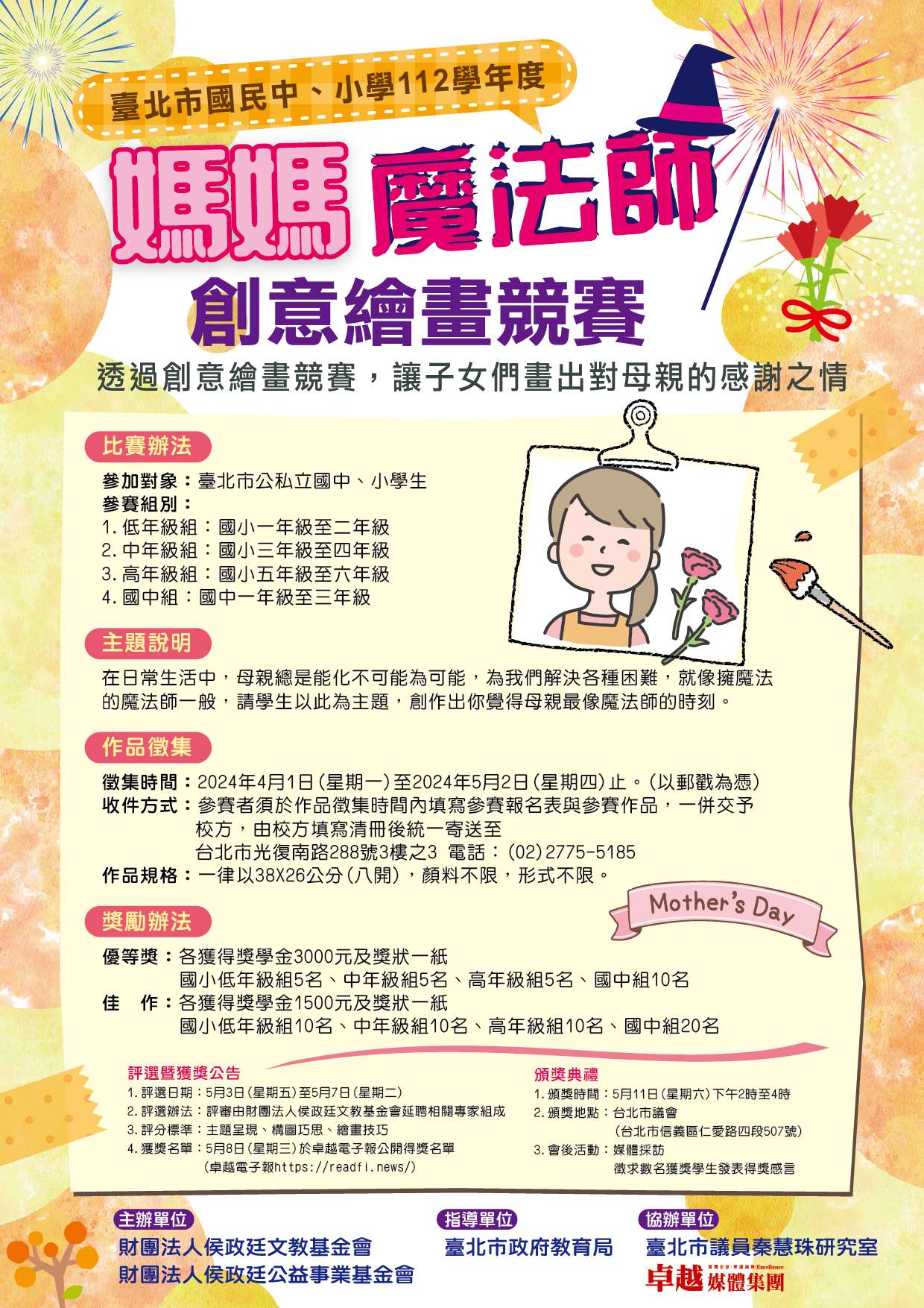 2、頒獎地點:臺北市議會(臺北市信義區仁愛路四段507號),頒獎典禮當日若不克出席請於6月底前自行攜帶證件至財團法人侯政廷文教基金會(臺北市光復南路288號3樓之3)領取獎學金及獎狀。