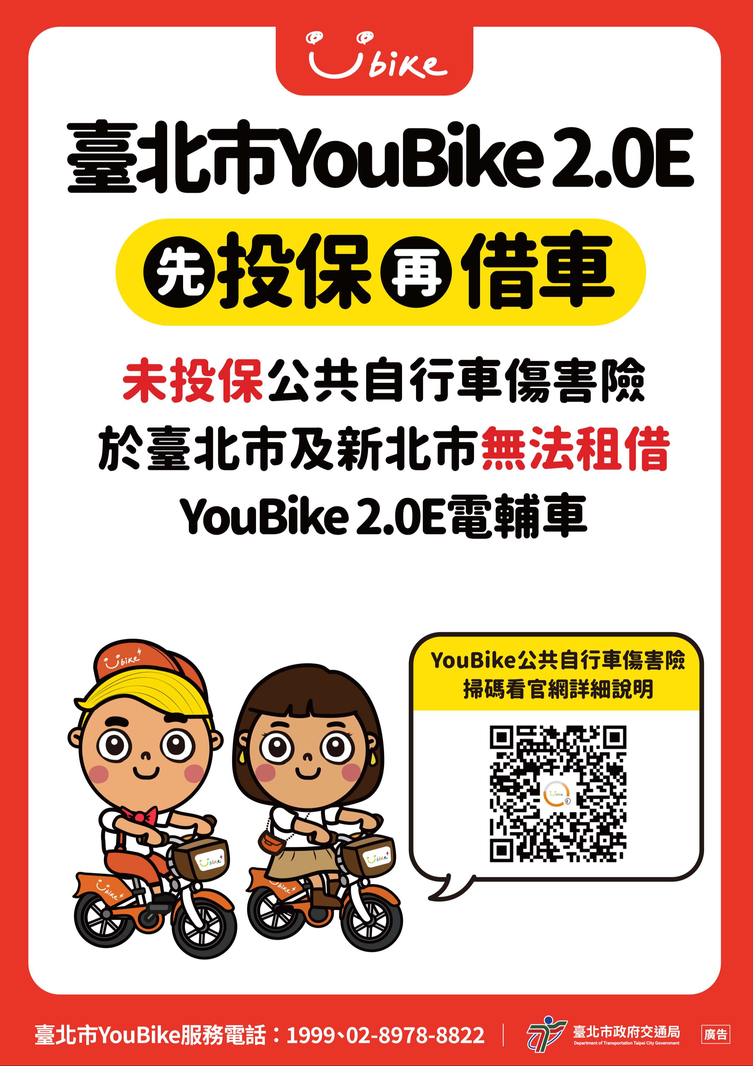 本市規劃於近期陸續引進公共電動輔助自行車YouBike 2.0E,考量其加速快、騎乘距離長等特性,YouBike使用者 須先投保公共自行車傷害險方能租借YouBike2.0E,以提升 其騎乘時之保障。