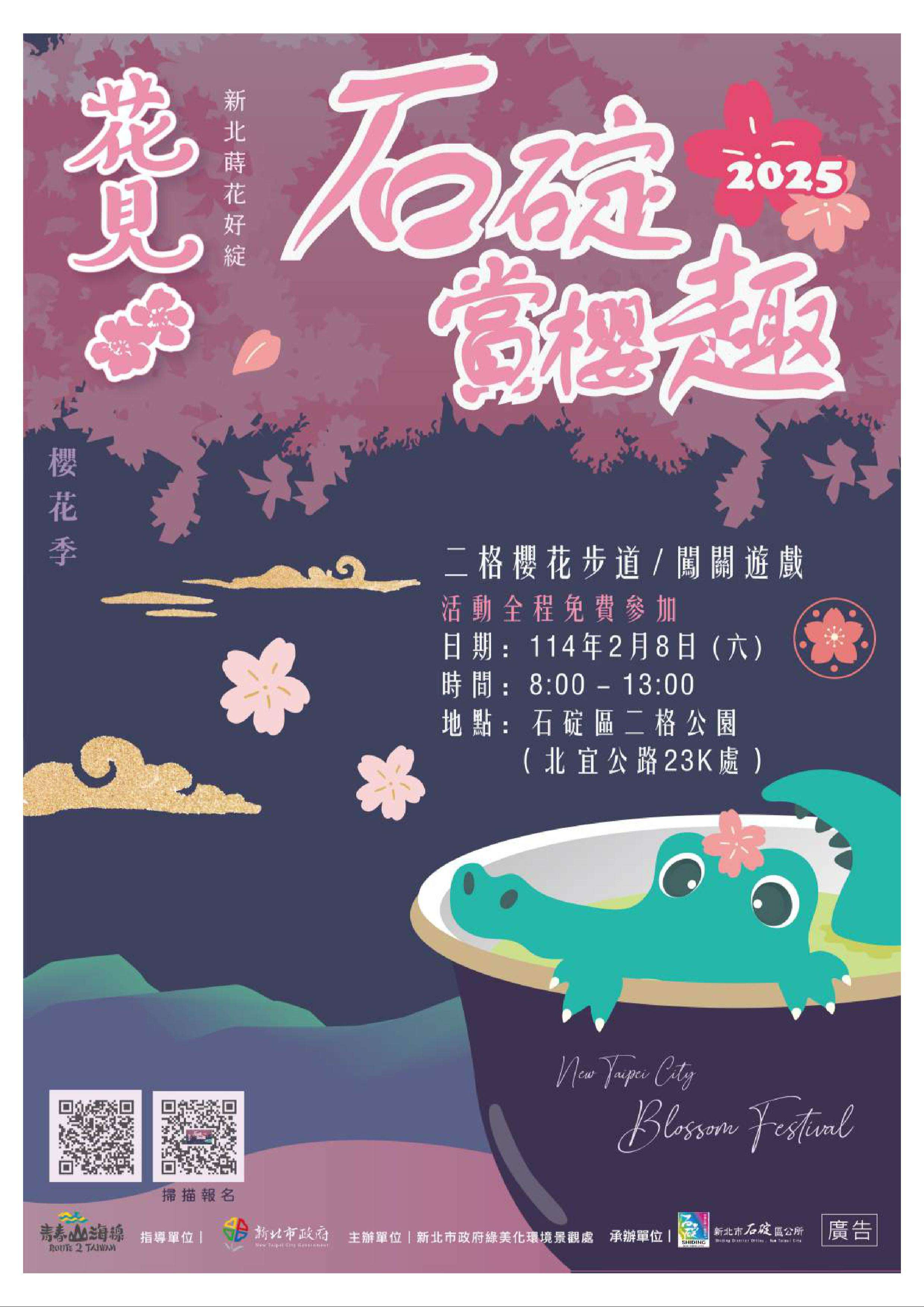 活動訂於114年2月8日(星期六)上午8時至下午1時辦 理,地點假二格公園(北宜路23公里處)、二格路沿線賞 櫻,活動詳情請參閱https://cpqweb.com/ntpciflower /。
