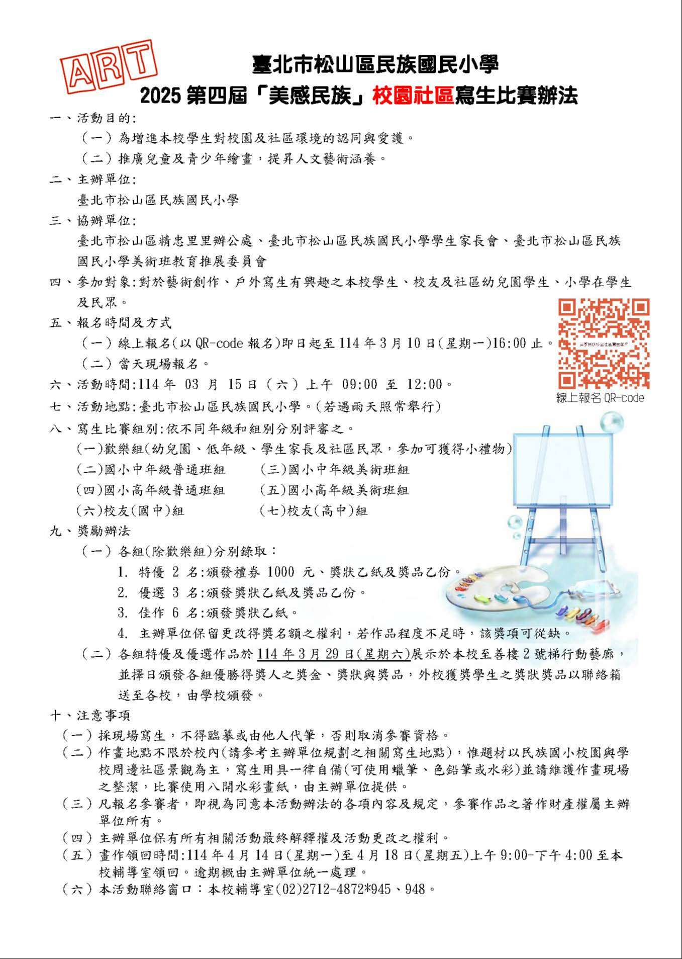 一、比賽時間:114年3月15日(星期六)早上9時至12時整。比賽 地點:臺北市民族國小(臺北市松山區民生東路四段97巷7 號),若遇雨天照常舉行。