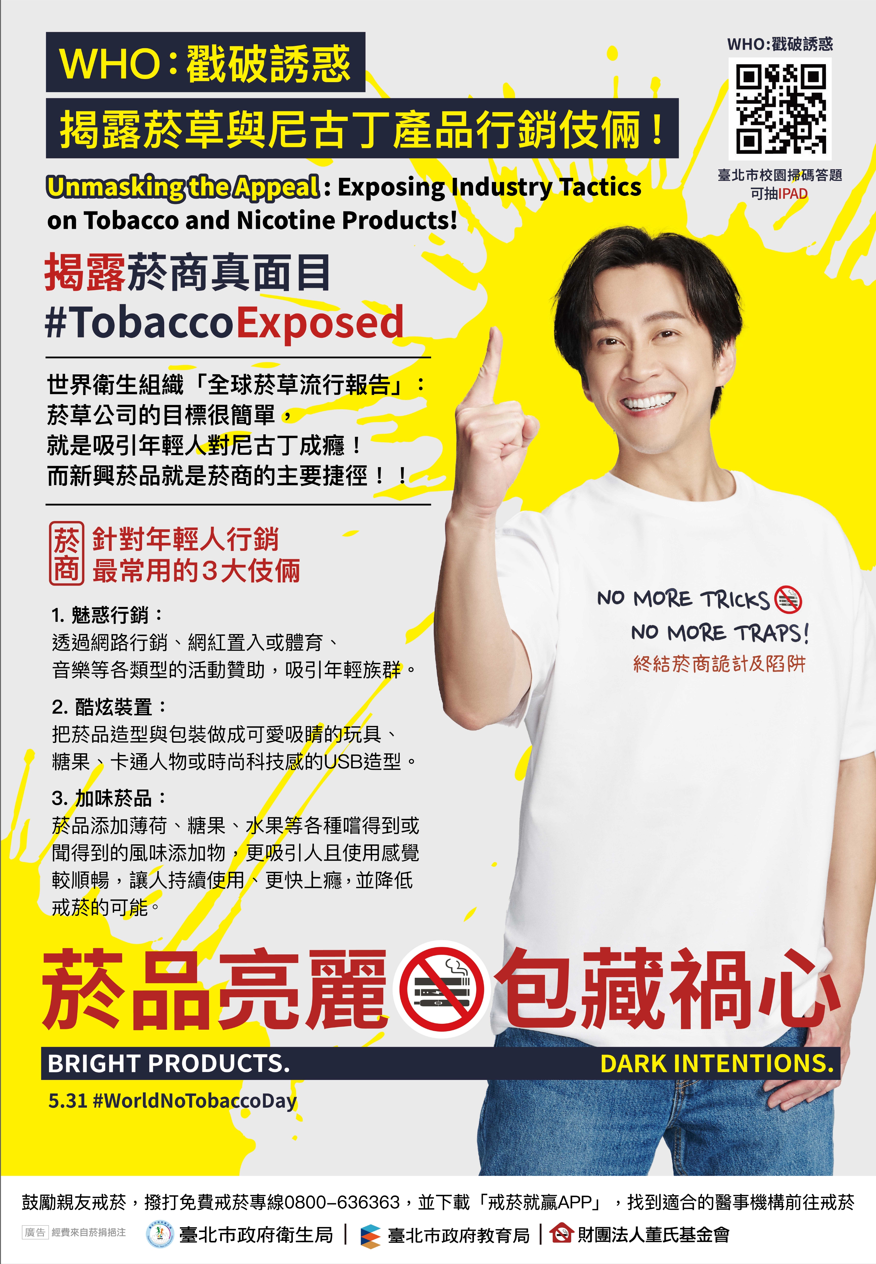 臺北市衛生局、教育局與董氏基金會聯手,響應2025年WHO最新「揭露菸商真面目-戳破菸品誘惑」主軸,舉辦掃碼答題抽獎行動。透過校園學生答題與國際菸害防制接軌,還有機會抽中iPad和郵局現金禮券!