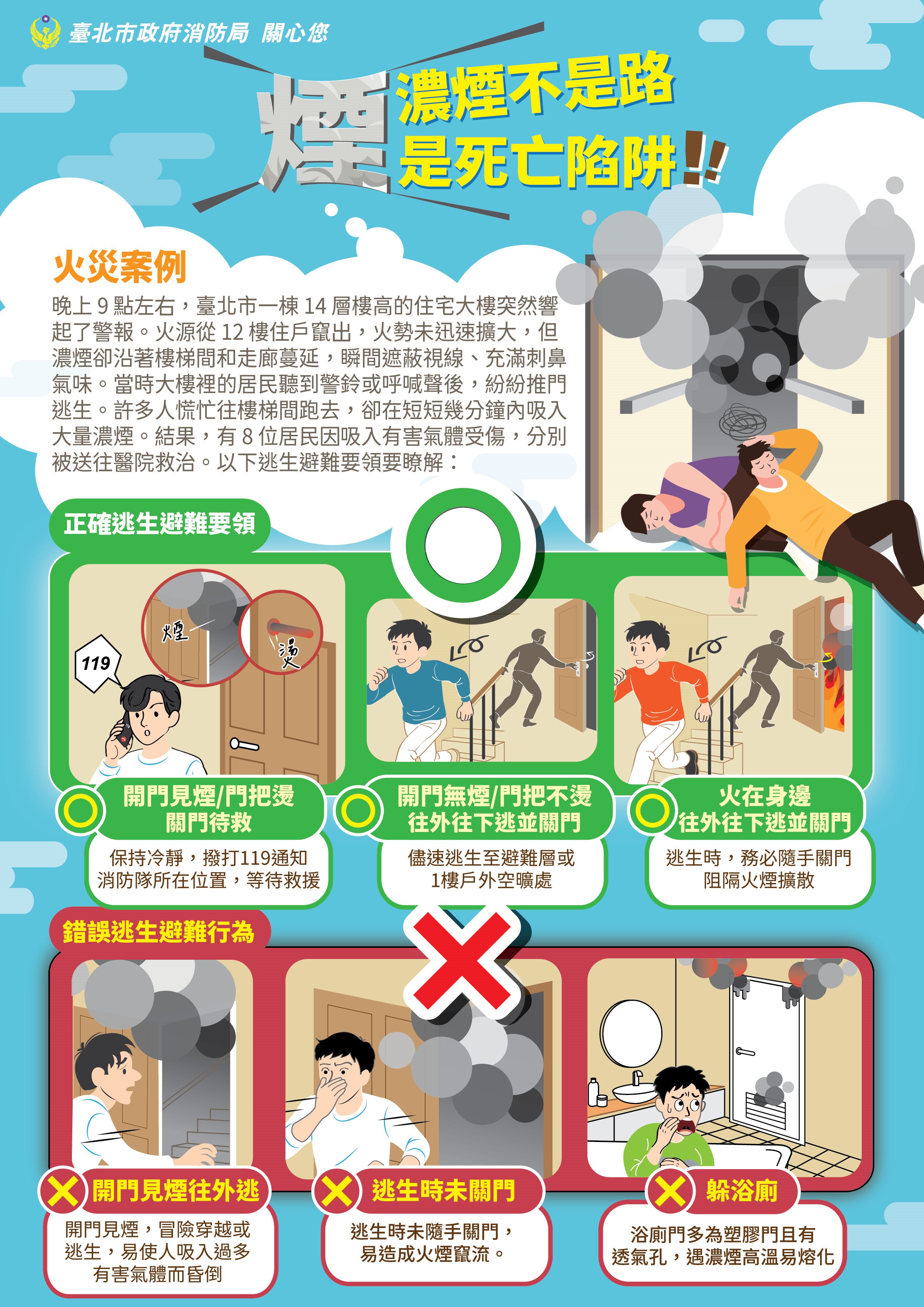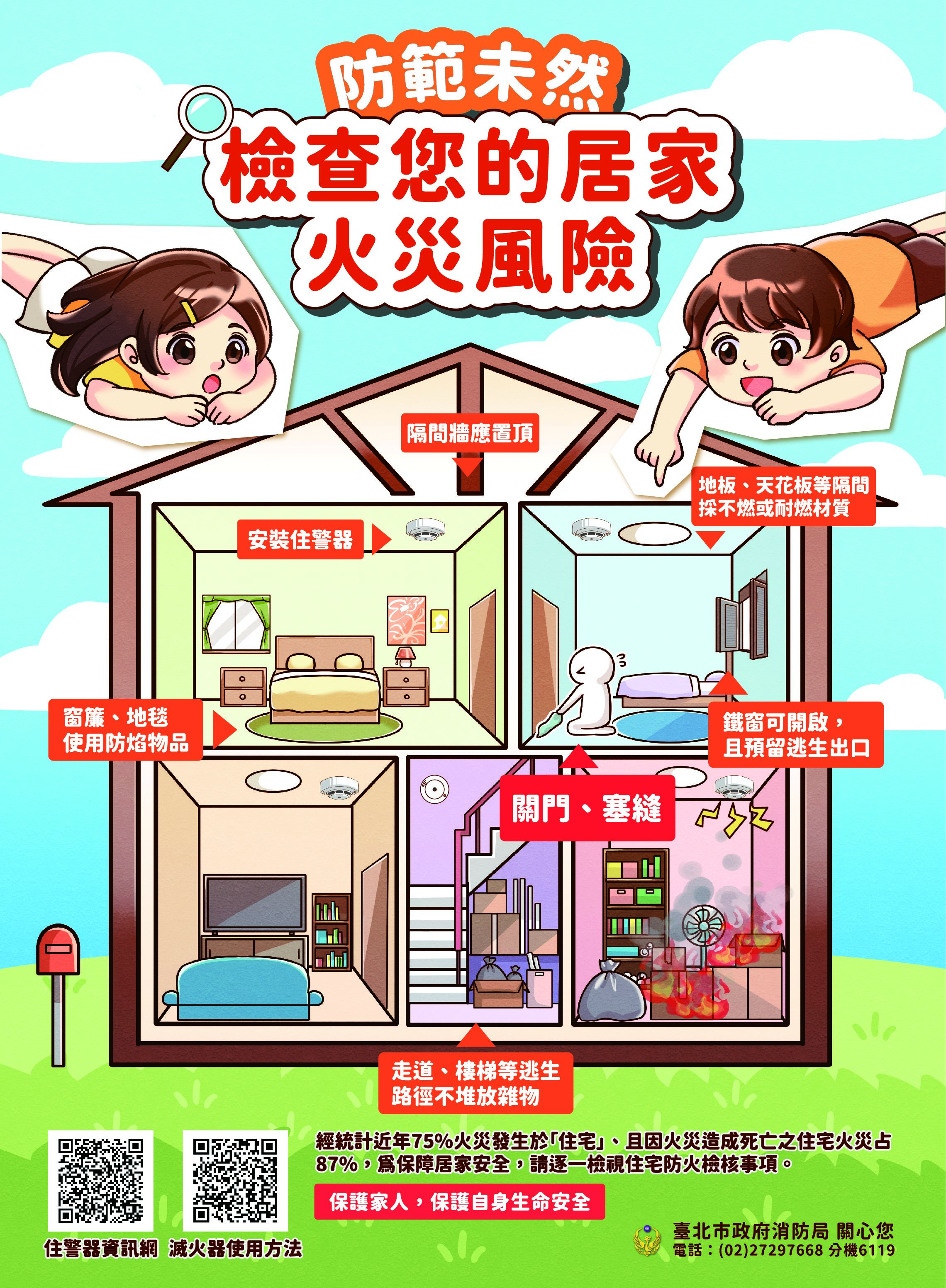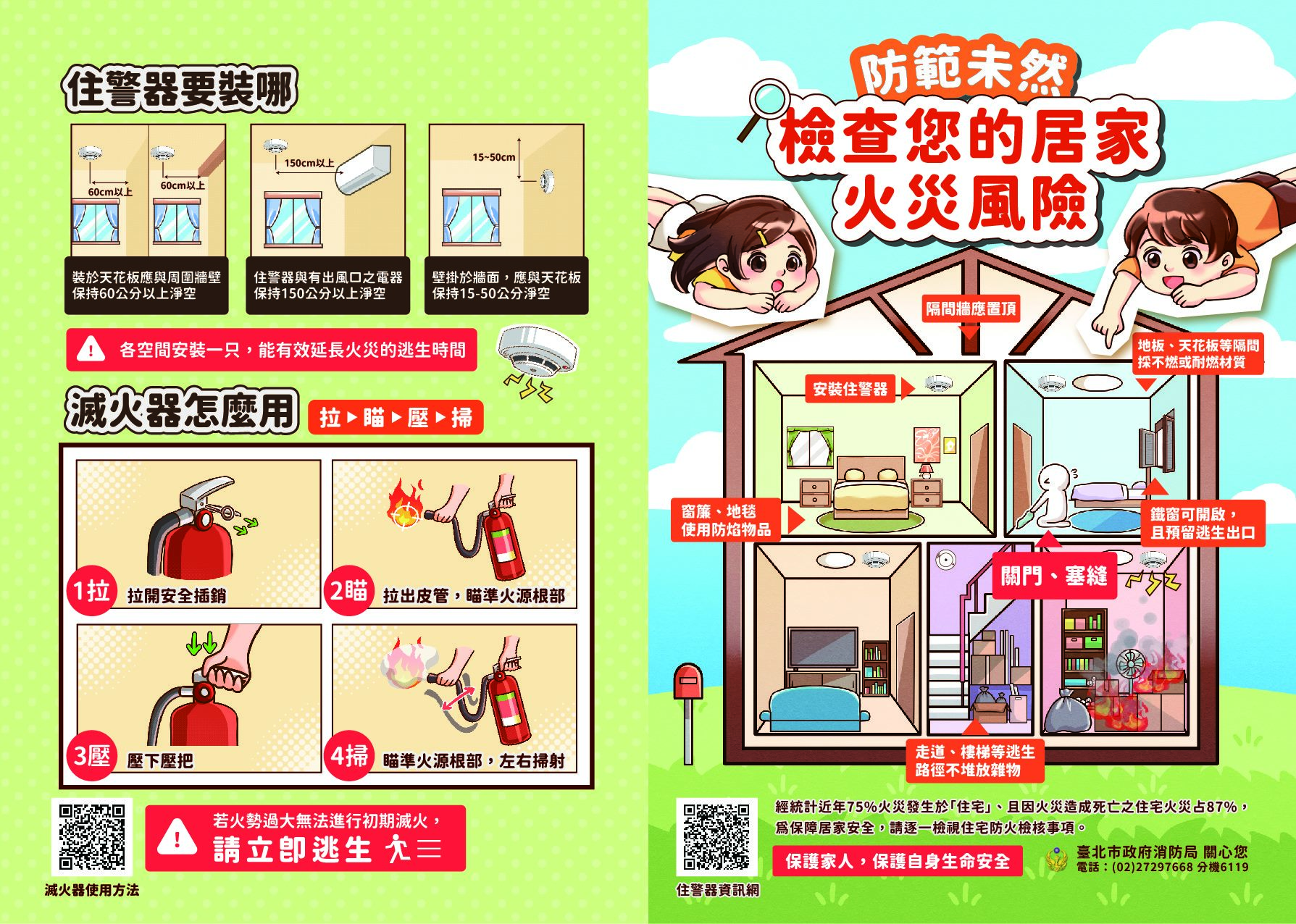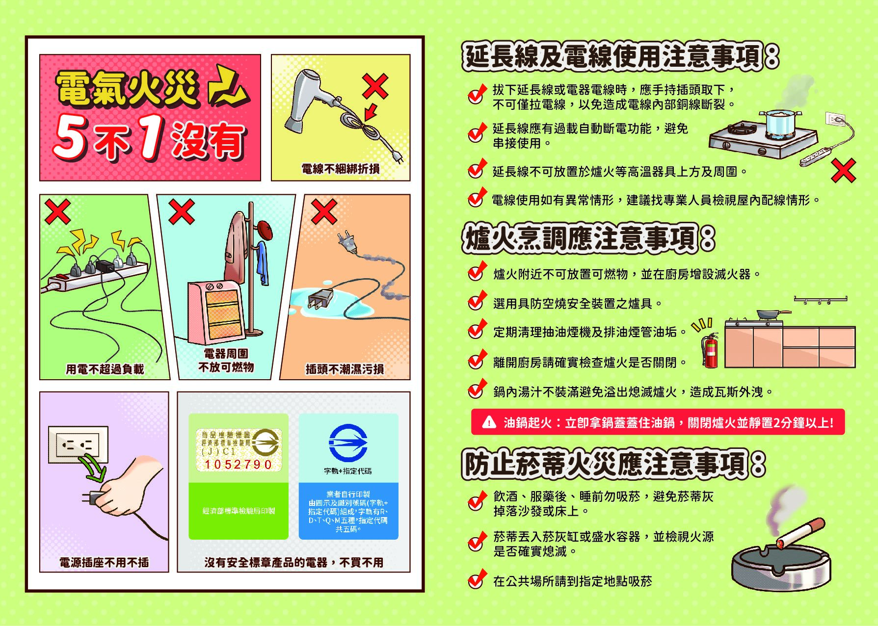 防範電氣火災記得五「不」一「沒有」:用電不過載、電線不綑綁、插頭不污損、插頭不用不插、周圍不放可燃物,沒有安全標章的電器不買不用。
