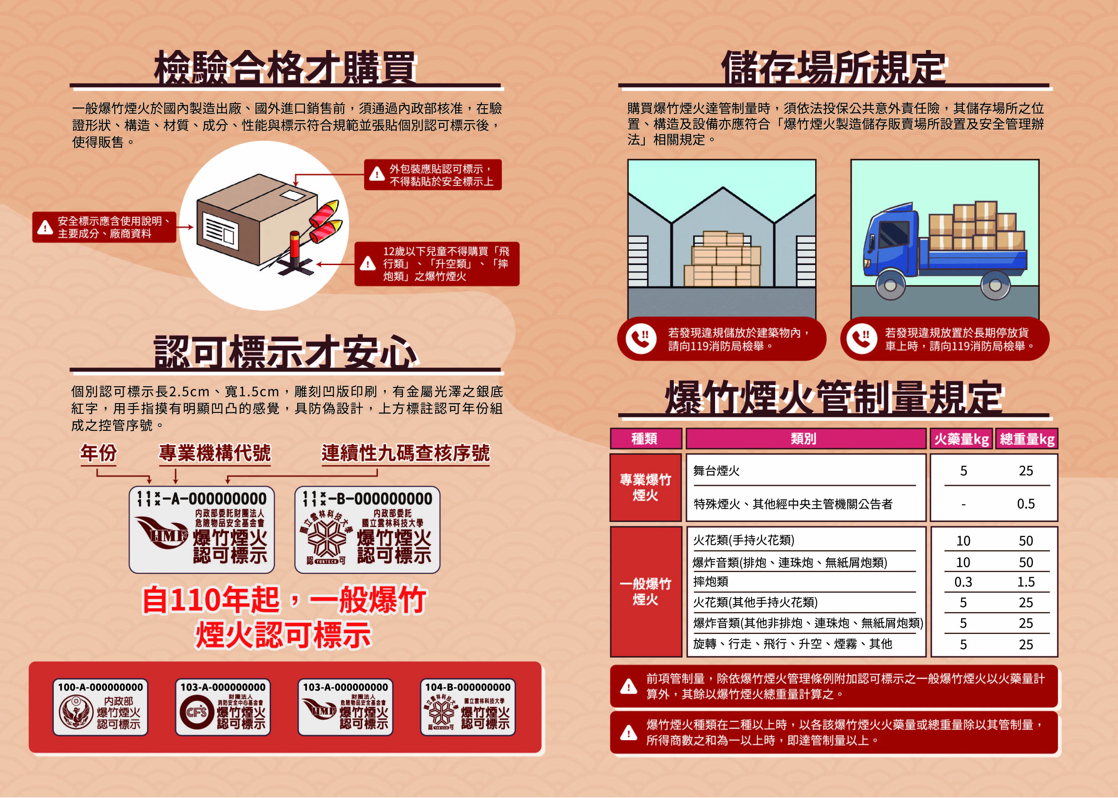 燃放爆竹煙火,注意五要原則:要重安全環保施放、要合格標示再施放、要依使用說明來施放、要選適當地點才施放、要大人陪同施放。