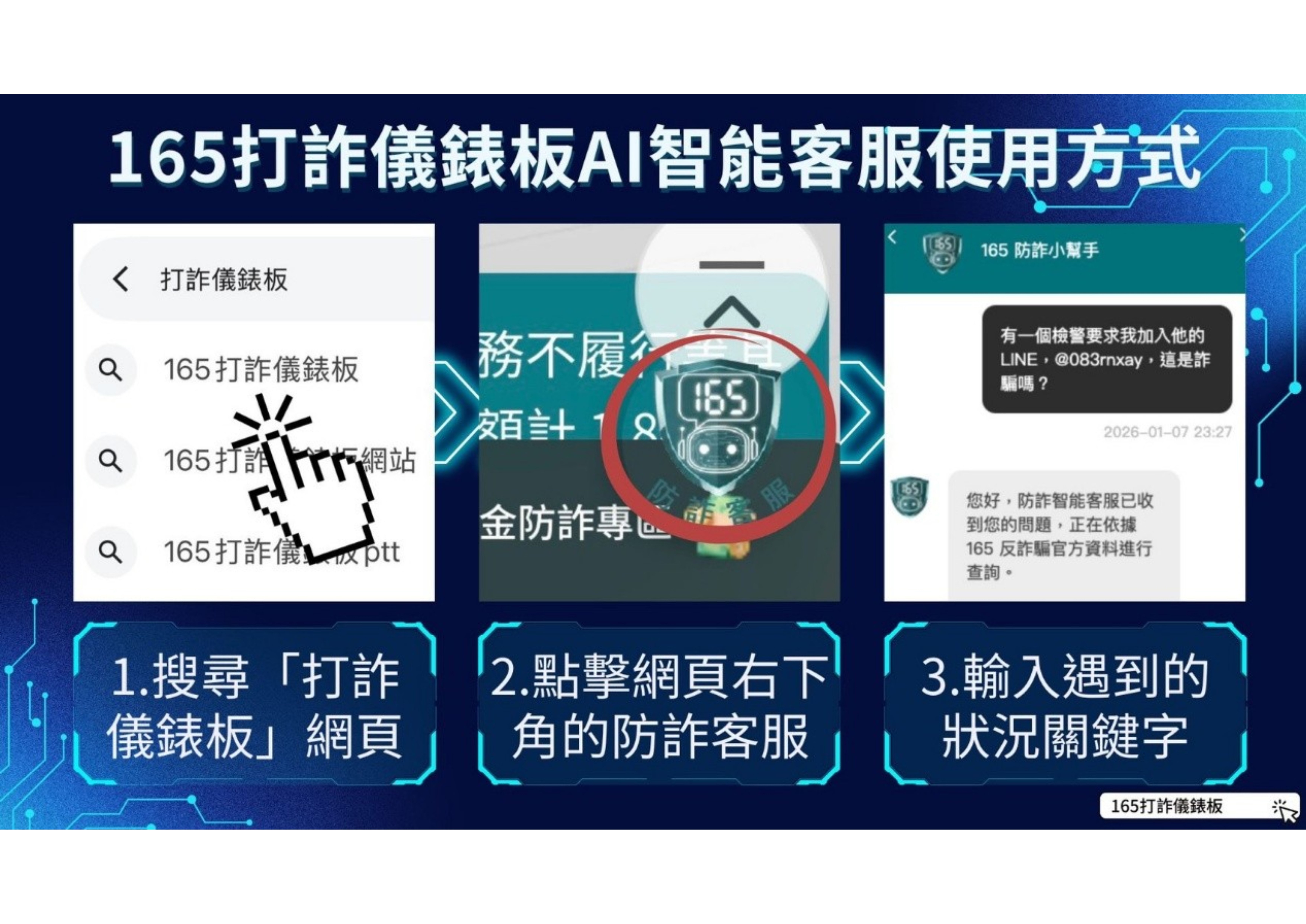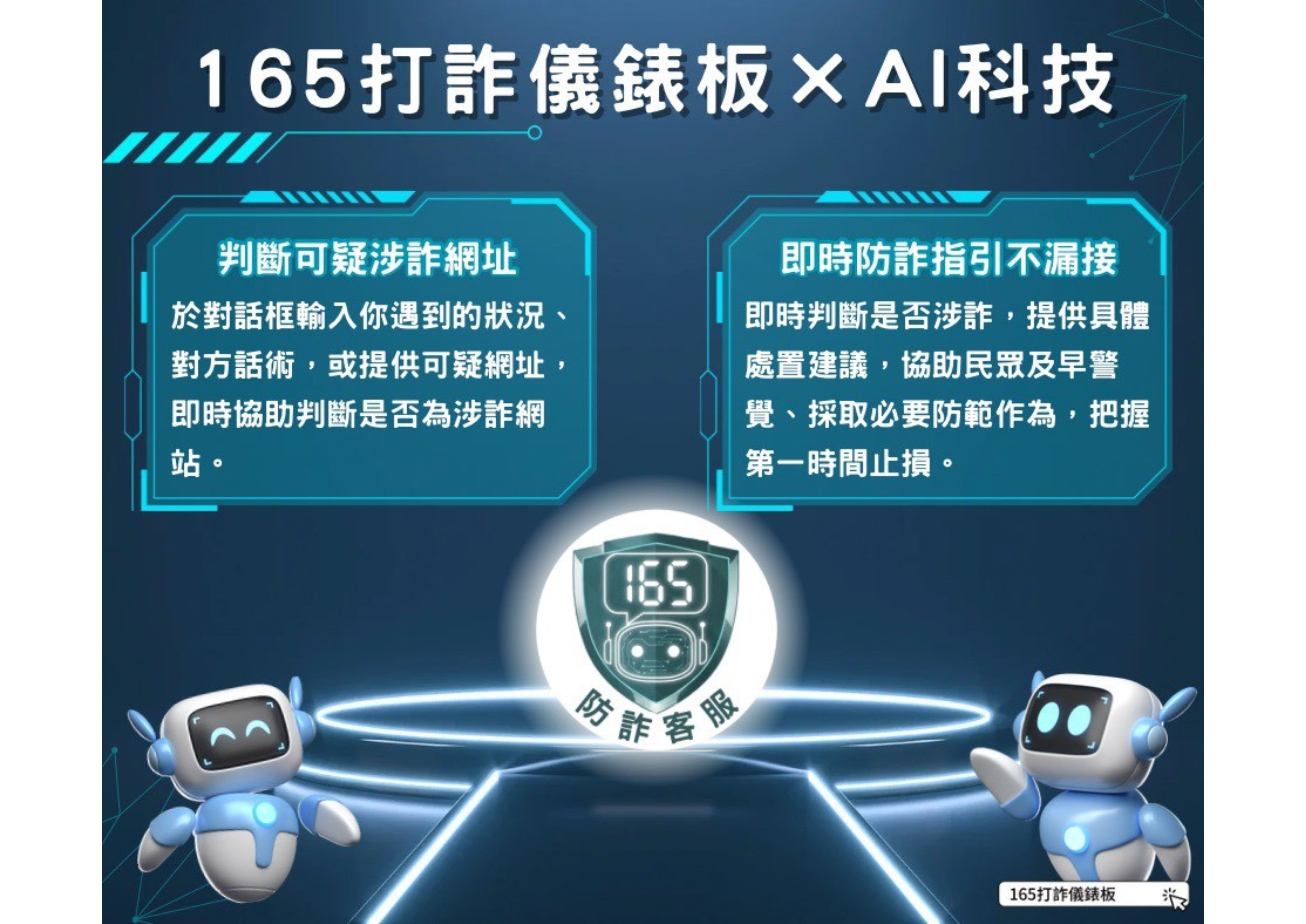 二、為因應詐騙手法快速演變,內政部警政署於「165打詐儀錶 板」導入AI智能客服小幫手,整合防詐資料庫提供即時互 動諮詢,可依民眾描述情境辨識詐騙風險並提供具體處置 建議;另具備涉詐網址即時查詢功能,可判斷網站是否具 詐騙風險。