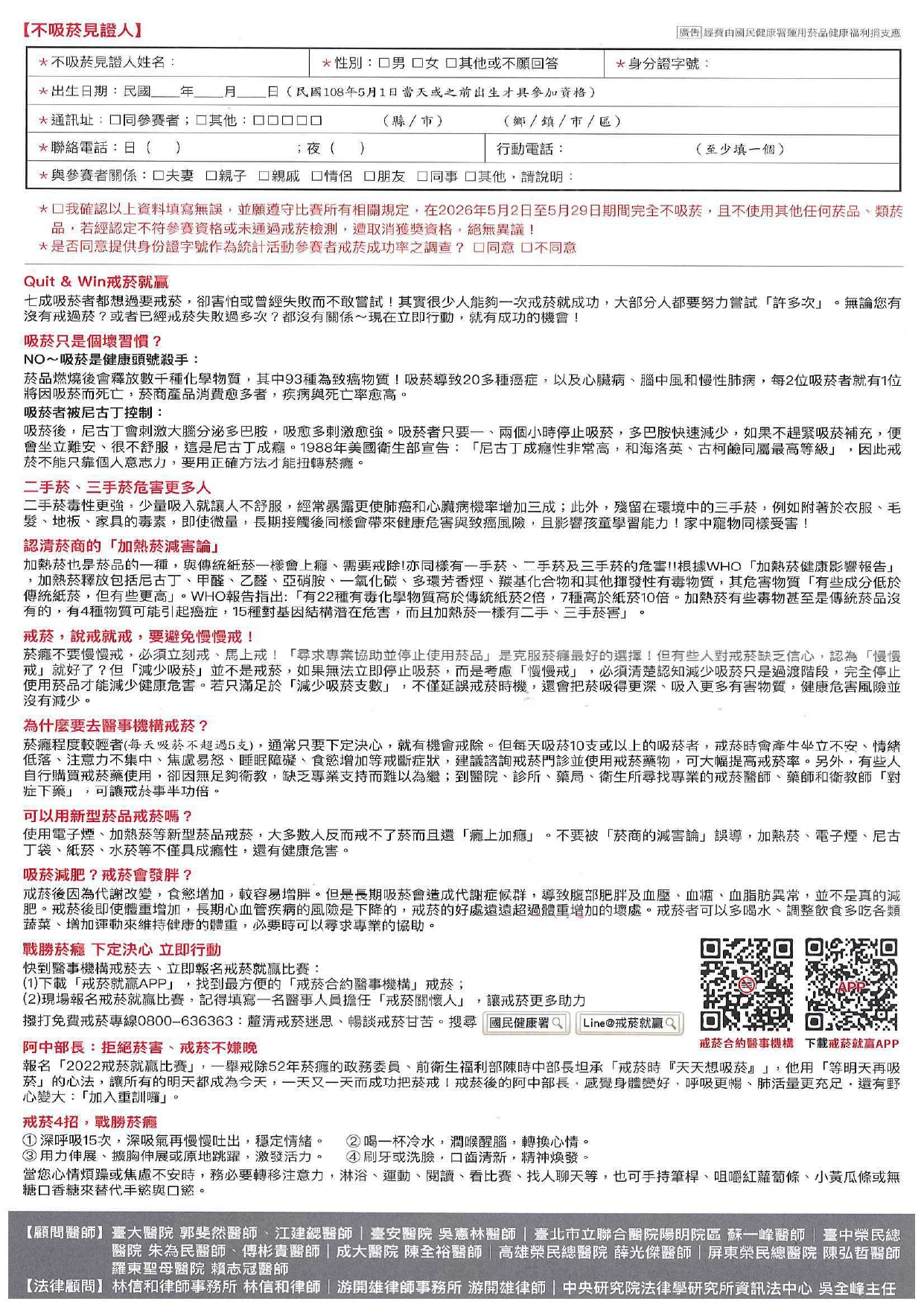 (四)報名資格: 1、吸菸的「參賽者」:報名截止前須年滿20歲、具中華 民國國籍或國內連續居住1年以上,報名前吸菸(含加 熱菸)至少1年,且有意嘗試戒菸者。 2、不吸菸的「見證人」:須年滿7歲,未曾吸菸或已戒菸 (不使用菸品、類菸品)1年以上,且為參賽者之家 人、師長、朋友、同學、同事、共同生活或其他經常 相處,願意支持並見證參賽者完全戒菸之人。 3、「戒菸關懷人」:須為戒菸服務合約醫事機構的醫事 人員,願意支持協助參賽者戒菸(不得同時擔任見證 人)。